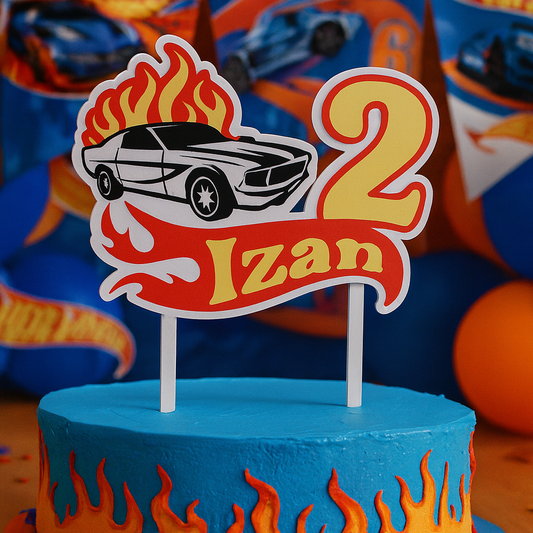 Topper de cumpleaños Hot Wheels – Coche de carreras con llamas, personalizado con nombre y edad