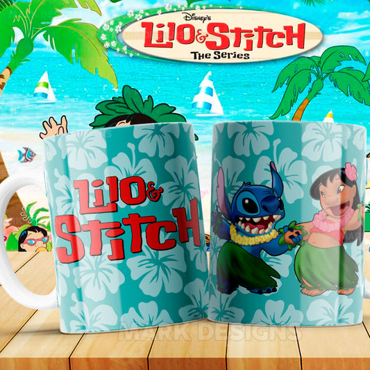 Taza Lilo & Stitch – Baile hula sobre fondo hawaiano