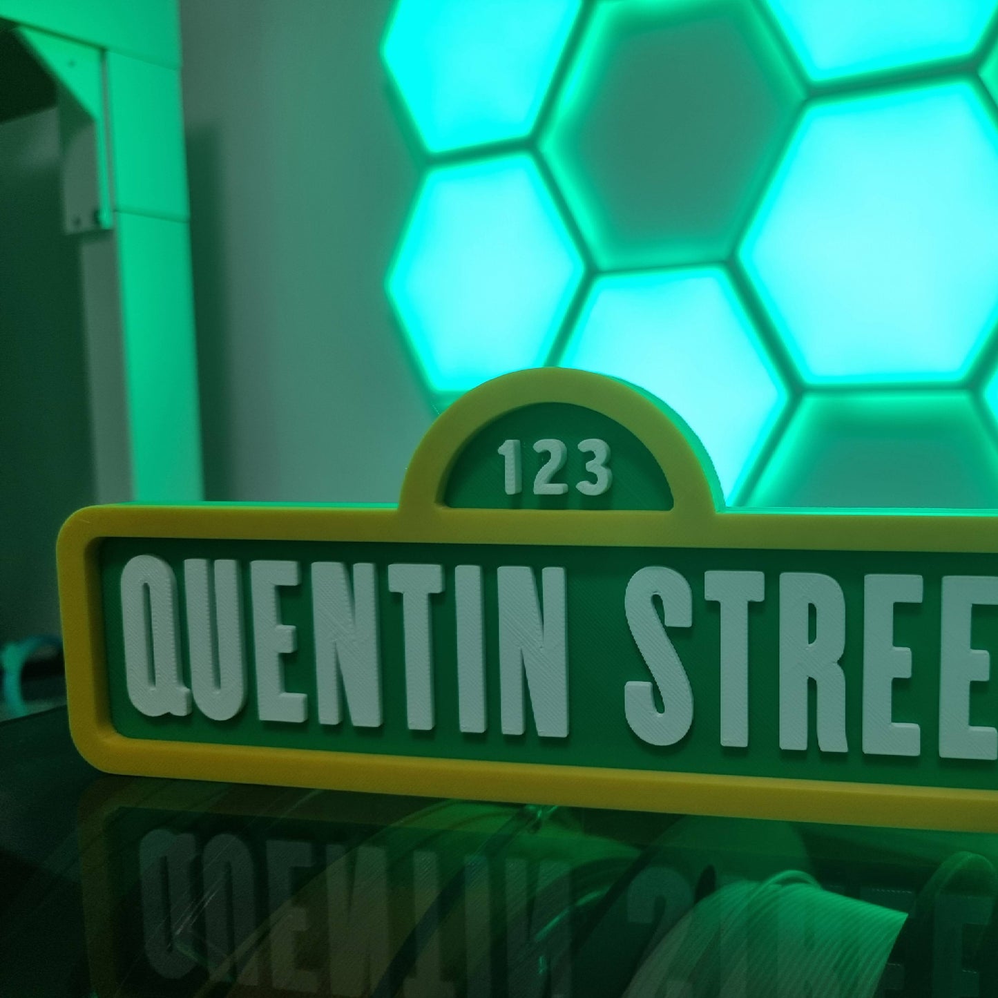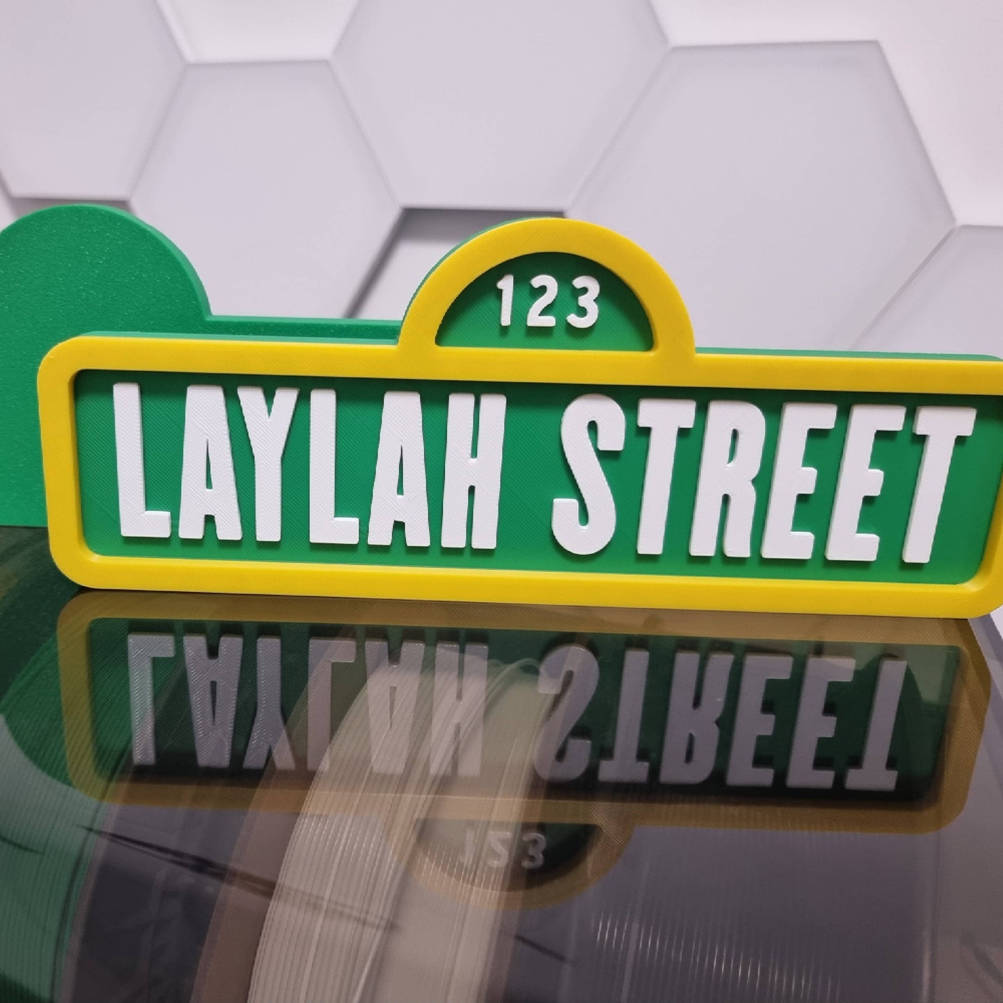 Letrero con diseño de Barrio Sésamo personalizado con nombre. Hecho en 3D con PLA.