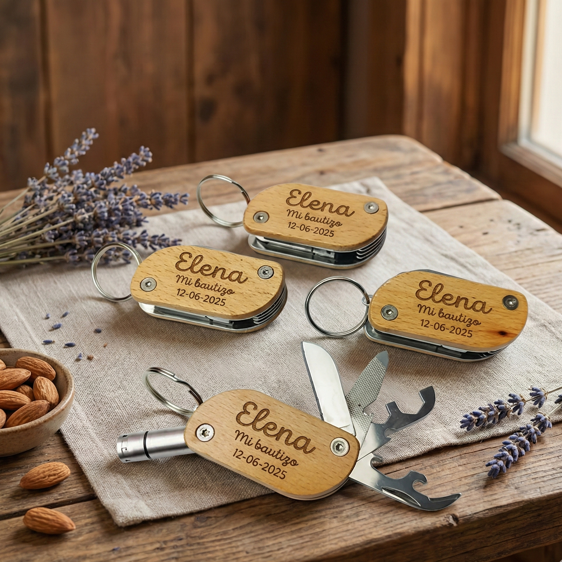¿Buscas un regalo que sea tan práctico como memorable? Este llavero multiherramienta es la solución perfecta. Combina la robustez del acero inoxidable con la calidez y el tacto natural de la madera, creando una pieza única que tus invitados usarán una y otra vez.