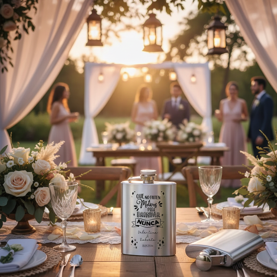 Nuestra petaca de acero inoxidable combina la elegancia clásica con un toque moderno y personal. Con una capacidad de 175 ml, es el detalle perfecto para invitados de boda, cumpleaños o eventos especiales. Su diseño ergonómico y ligeramente curvado está pensado para adaptarse cómodamente a la forma del cuerpo, permitiendo guardarla en el bolsillo de forma discreta y segura.