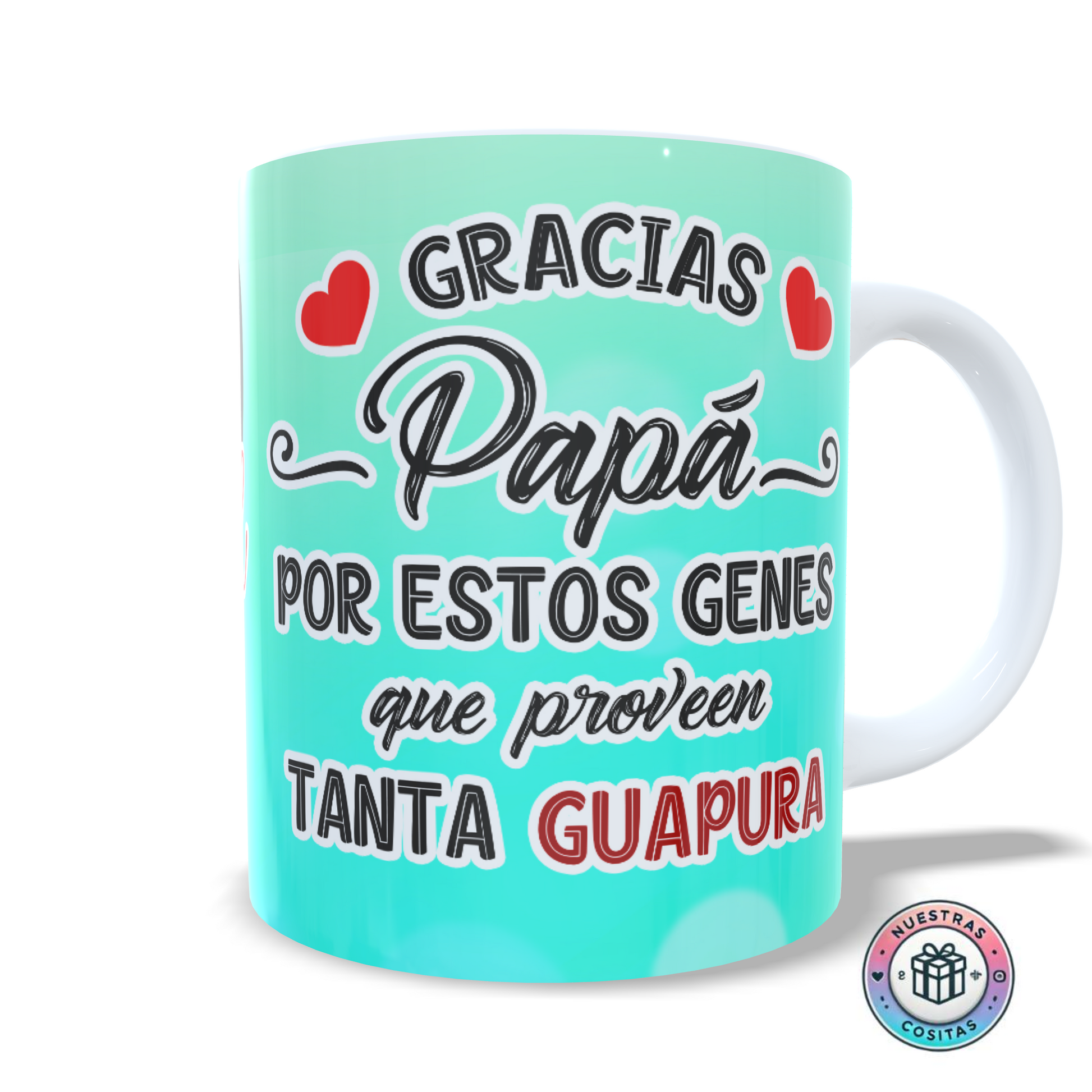 Esta taza divertida y original es el regalo perfecto para papás con buen sentido del humor. Con el mensaje “Gracias papá por estos genes que proveen tanta guapura”, será su favorita para disfrutar su café o té diario. ☕💙