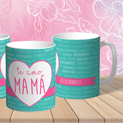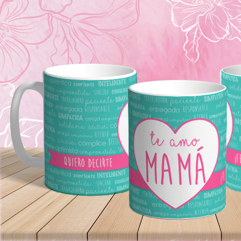 💬 El diseño destaca un gran corazón central con el mensaje “Te amo mamá” rodeado de cualidades bonitas que la representan.