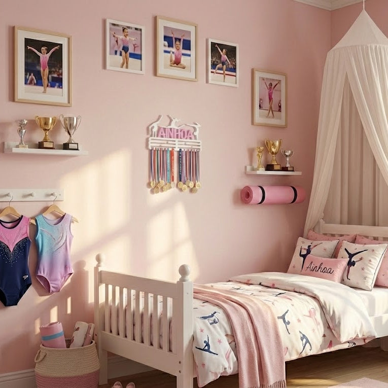 Este colgador no es solo un organizador, es una pieza de decoración inspiradora que transformará su habitación. Con un diseño elegante que presenta dinámicas siluetas de gimnastas en acción y su nombre personalizado en un precioso color de contraste (como el rosa del ejemplo), este medallero será el centro de todas las miradas.