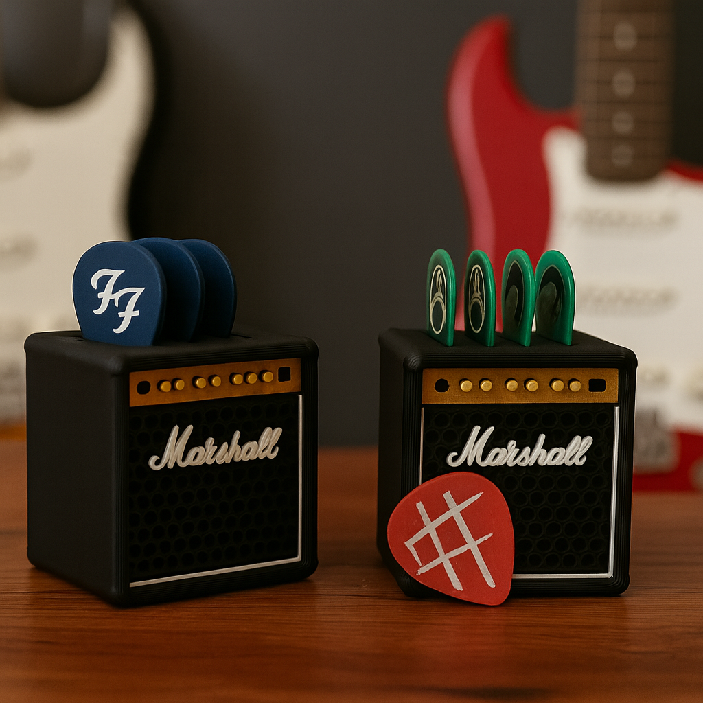 🎶 Dale estilo rockero a tu rincón musical con este porta púas en forma de mini amplificador con diseños Marshall, Gibson, Fender y Orange.