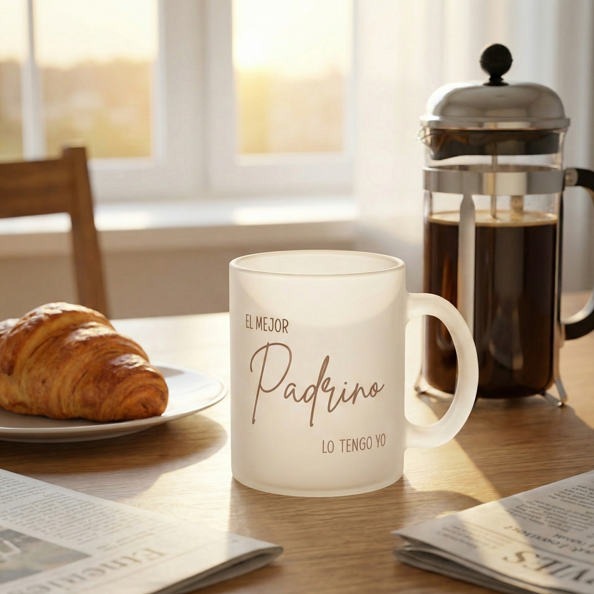 Su diseño destaca por un sofisticado acabado esmerilado (translúcido), que deja pasar la luz suavemente, creando un efecto visual moderno y delicado. La frase "El mejor Padrino lo tengo yo" está impresa con una tipografía cuidada que resalta sobre la textura del vidrio, convirtiendo cada desayuno o merienda en un momento lleno de cariño.