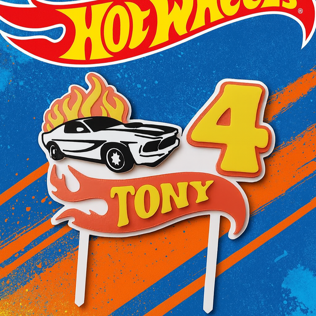 🔥 Lleva la emoción de Hot Wheels a la fiesta con este cake topper de coche de carreras lleno de velocidad y llamas. Ideal para cumpleaños infantiles, se personaliza con el nombre y la edad del cumpleañero, convirtiéndose en el detalle perfecto para decorar la tarta y sorprender a los pequeños fans de Hot Wheels. 🚗🔥